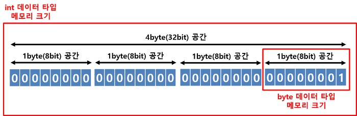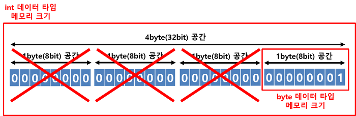 이와 같은 그림이 나옵니다. int 데이터 타입에 저장된 정수 1의 값은 실제 메모리에 저장될 때 00000000 00000000 00000000 00000001 의 값을 가집니다. 이 값을 byte 데이터 타입에 끝에 1byte(00000001) 영역만 넣자니 앞에있는 3byte (00000000 00000000 00000000) 값이 날아갑니다. 그림으로 보면 이렇습니다.
