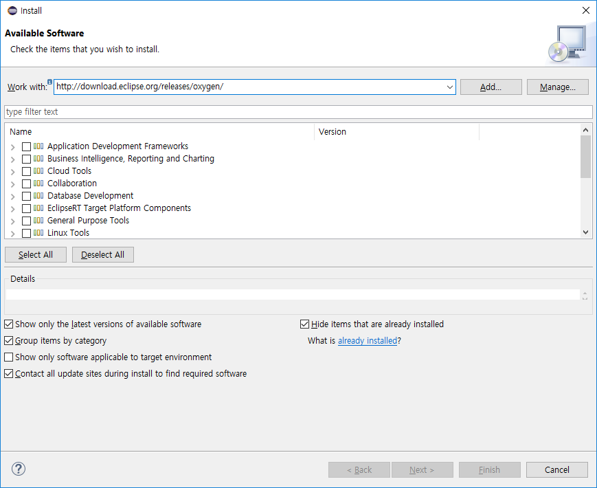 여기에 Work with에 http://download.eclipse.org/releases/oxygen(이놈엔 여러분 이클립스 버전을 적어라) 까지 타이핑하면 목록에 주루륵 생긴다.