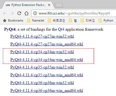- Riverbank에서 더이상 PyQt4 빌드를 제공하지 않으므로, http://www.lfd.uci.edu/~gohlke/pythonlibs/#pyqt4 사이트를 방문하여 PyQt4 wheel 파일을 로컬에 다운 받는다. 이때, 주의할 점은 *cp34*.whl 파일을 32비트 / 64비트 버전에 맞게 선택한다.