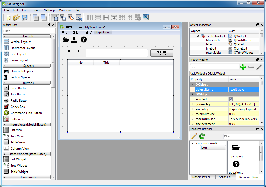 GUI 프로그램에서 사용하는 버튼, 레이블, 텍스트박스, 다이얼로그, 메인윈도우 등의 모든 UI 요소들을 가리켜 위젯(Widget)이라 부른다. 위젯의 가장 상위에 있는 클래스인 QWidget은 모든 UI 오브젝트 혹은 컨트롤들의 Base 클래스이다.